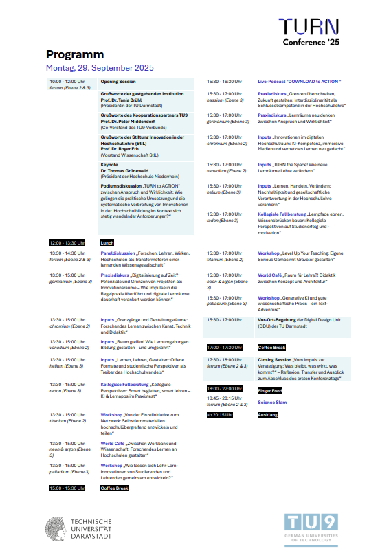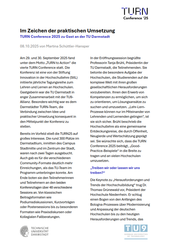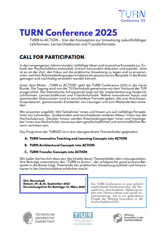 - StIL-Blogbeitrag vom 30. Juni 2025 zur TURN Conference 2025 – „TURN to ACTION“ für die Lehre. Ein Beitrag von Katharina Hettenhausen.